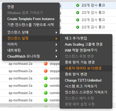 현재 실행되고 있는 EC2를 중지하고, 다음과 같이 사용자 데이터를 편집한다. EC2를 중지하고 다시 시작하면, EC2 스토어 볼륨은 지워진다. 이점을 유의해서 작업해야 한다.