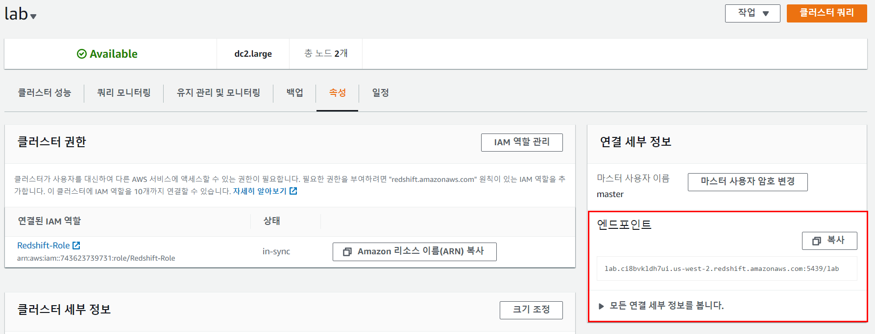 클러스터의 엔드포인트는 아래와 같이 확인할 수 있다. 클러스터가 available 상태여야 연결이 가능하다.