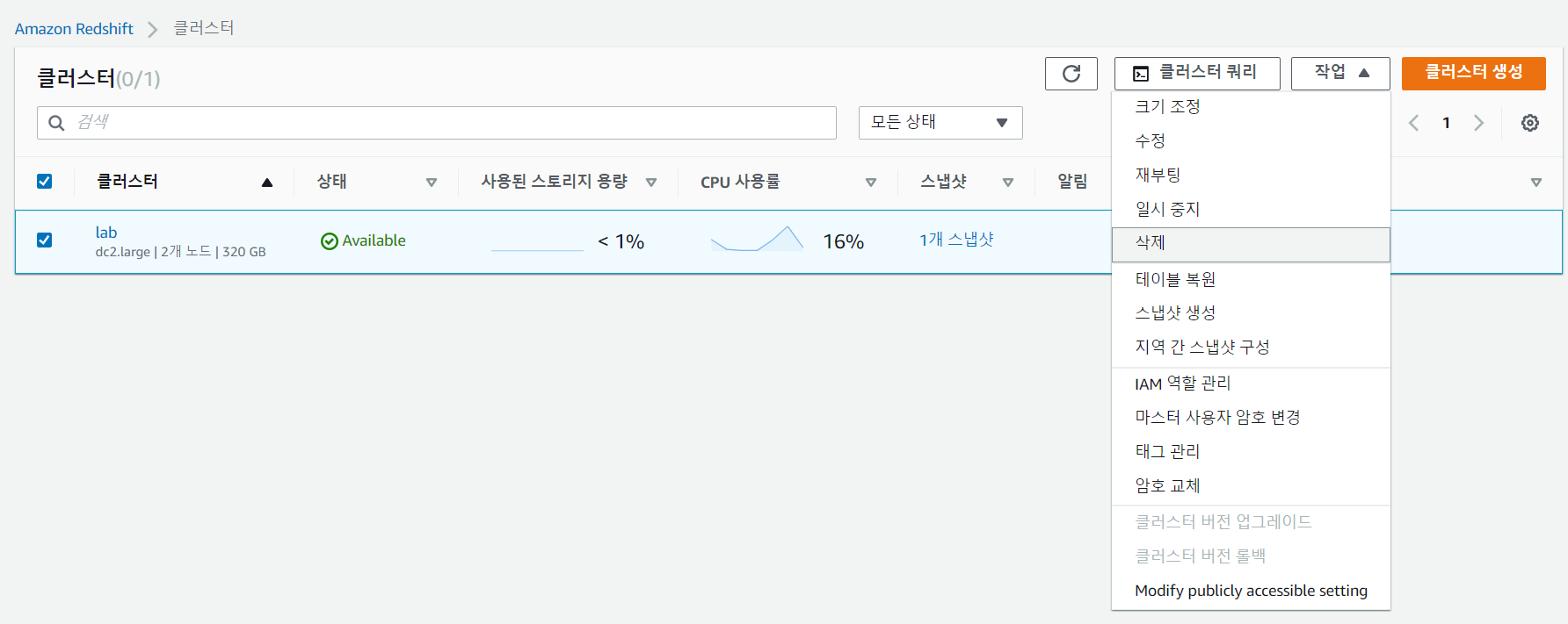 원하는 데이터 작업 후, 클러스터를 중지하거나 삭제한다.