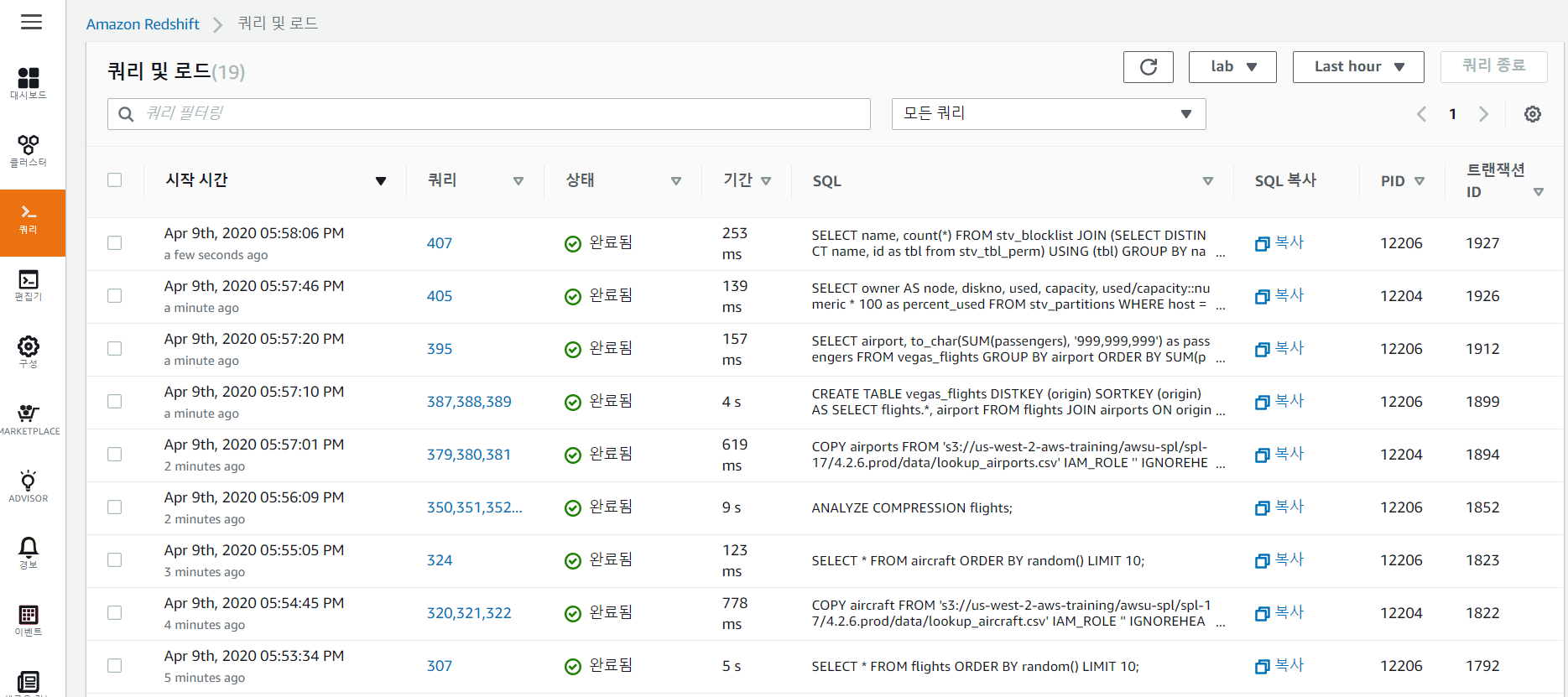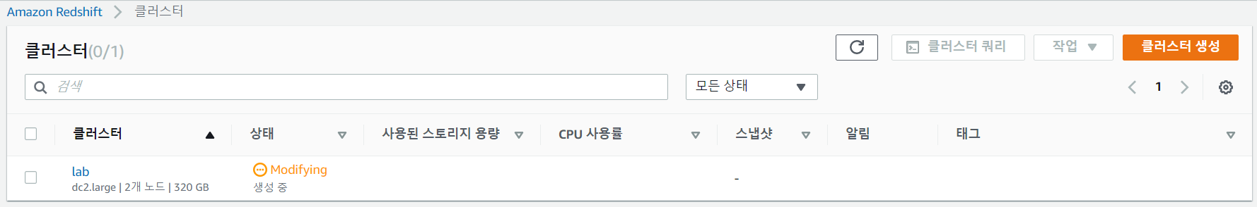 위와 같이 SQL를 통하여 Redshift를 이용하였다. AWS 콘솔 상에서 쿼리와 관련된 모니터링을 확인할 수 있다.
