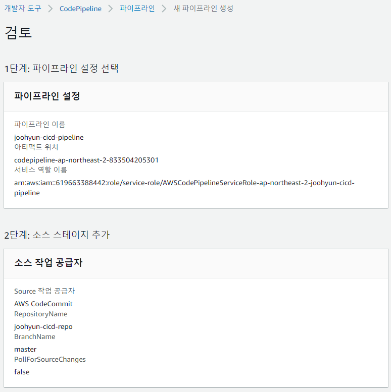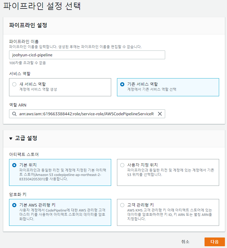 파이프라인 설정 선택의 파이프라인 이름을 입력하고, 서비스 역할에서 CodePipeline이 IAM에 서비스 역할을 생성하도록 허용한다.