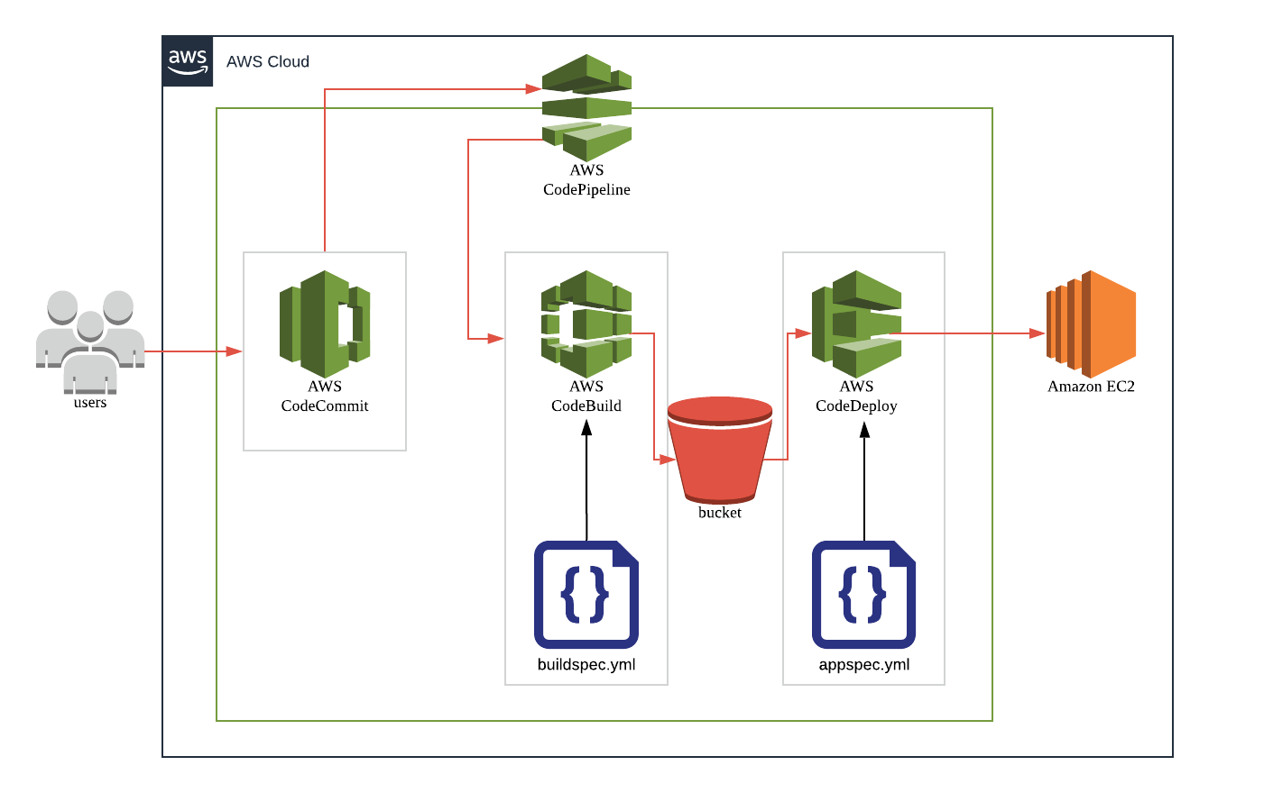 AWS에서 제공하는 서비스를 이용한 CI/CD 구성은 다음과 같다.
