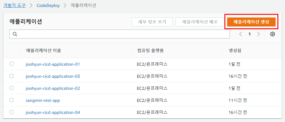 CodeDeployDefault.AllAtOnce : 한 번에 가급적 많은 수의 인스턴스에 애플리케이션 개정을 배포한다. 어떤 인스턴스에도 애플리케이션 개정이 배포되지 않으면 전체 배포 상태가 실패로 표시된다.