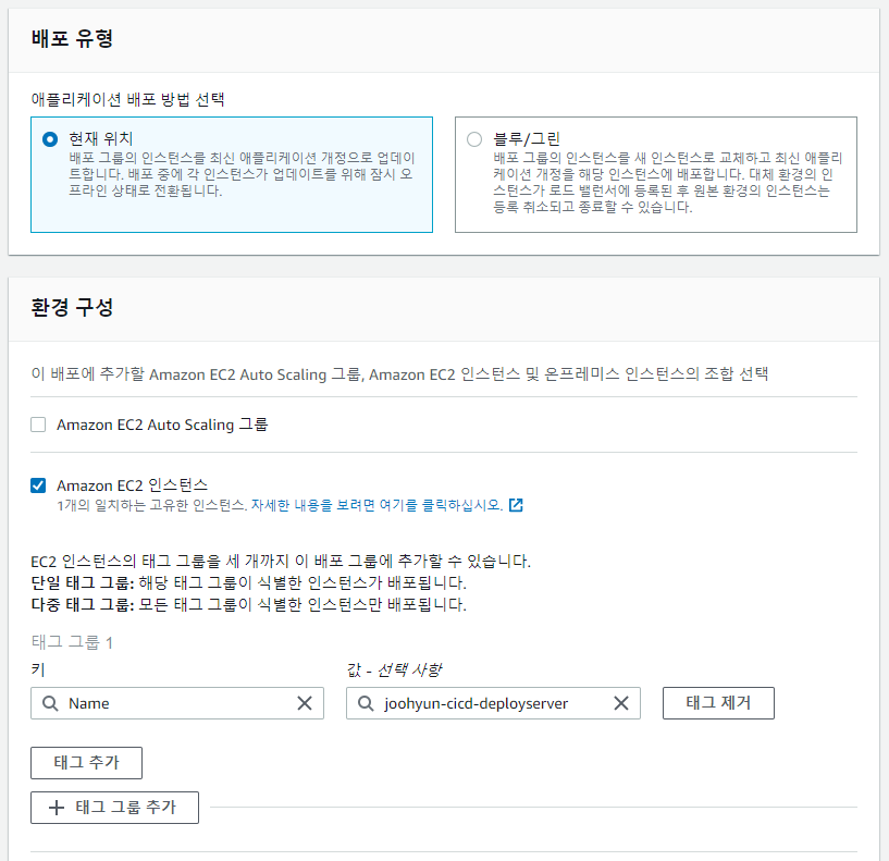 배포 유형은 현재 위치로 선택한다. 환경 구성에서 Amazon EC2 인스턴스를 선택한다.