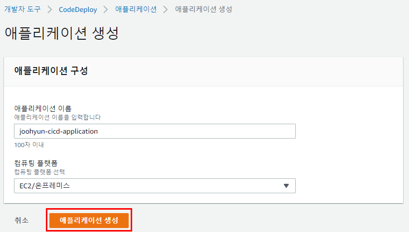 애플리케이션 이름을 입력하고, 컴퓨팅 플랫폼에서 EC2/온프레미스를 선택한다.
