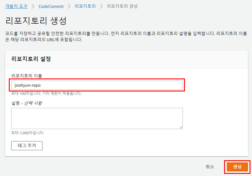 리포지토리 생성 페이지에서 리포지토리 이름(예: joohyun-repo)를 입력한다.