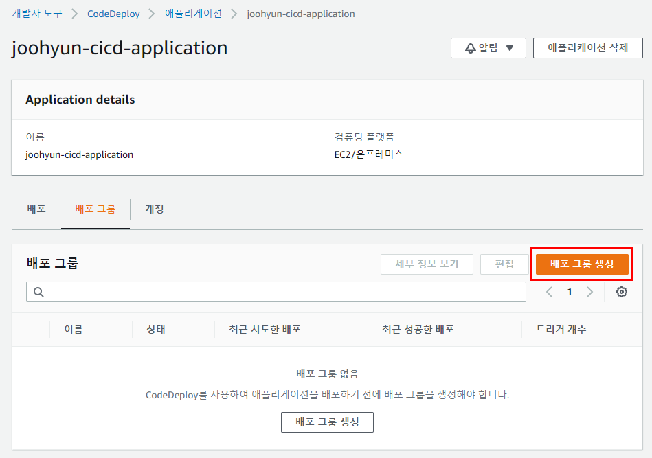 배포 그룹 설정이 완료된 것을 확인한다.애플리케이션이 EC2/온프레미스 컴퓨팅 플랫폼을 사용하는 경우, AppSpec file이 필요하다.
