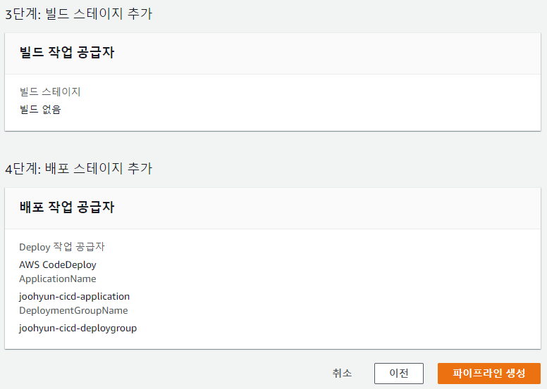 검토에서 정보를 검토한 다음, 파이프라인 생성을 선택한다.