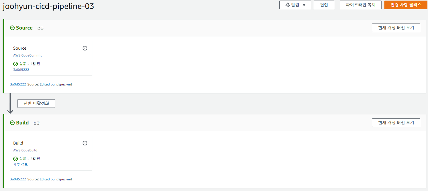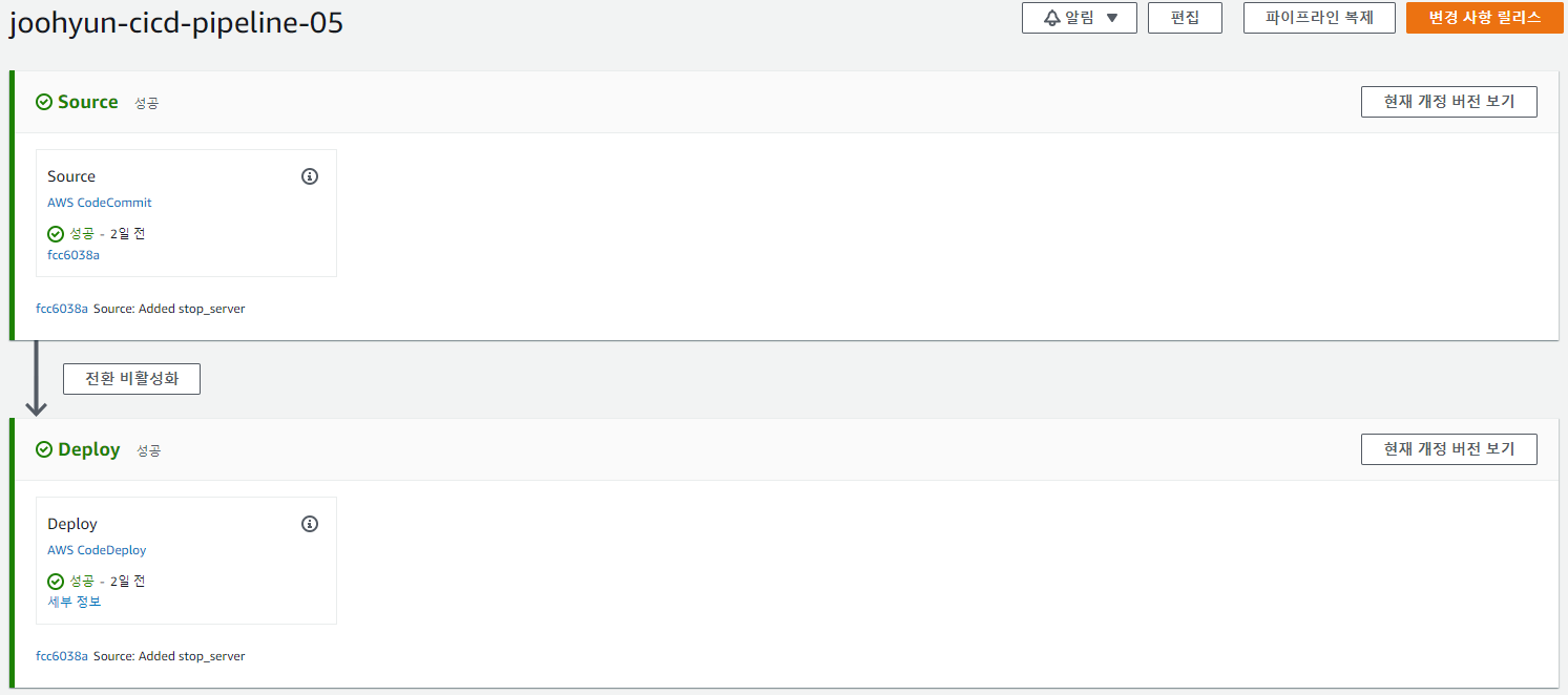이전에 만들었던 CodeCommit, CodeBuild, CodeDeploy를 연결하게 되면, 바로 CodePipeline을 통해 배포 가능하다.