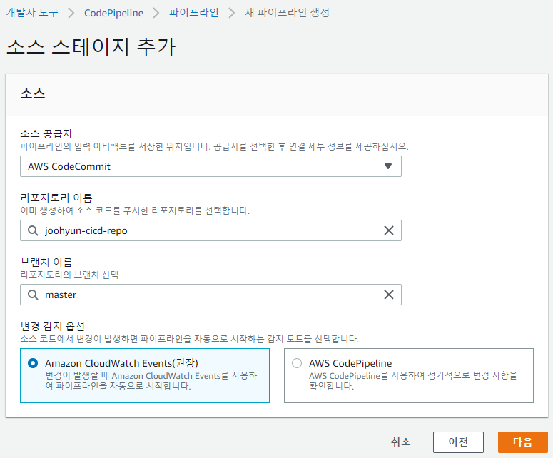 이전 단계에서 생성한 CodeCommit 리포지토리 이름을 선택한다. 브랜치 이름에서 master를 선택한다.