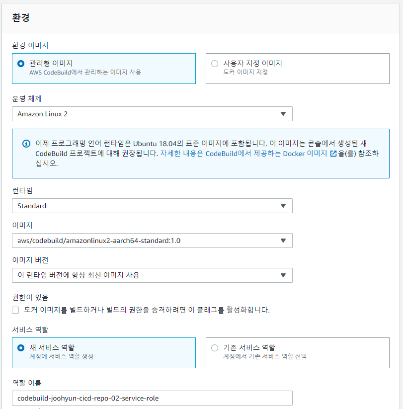 AWS CodeBuild가 관리하는 도커 이미지를 사용하려면 관리형 이미지를 선택한다. 다른 도커 이미지를 사용하려면 사용자 지정 이미지를 선택한다. (ARM, Linux, Linux GPU, or Windows 등)