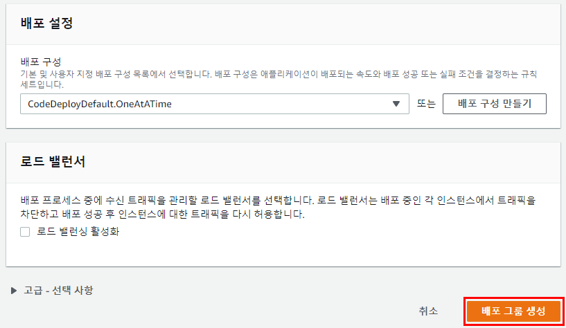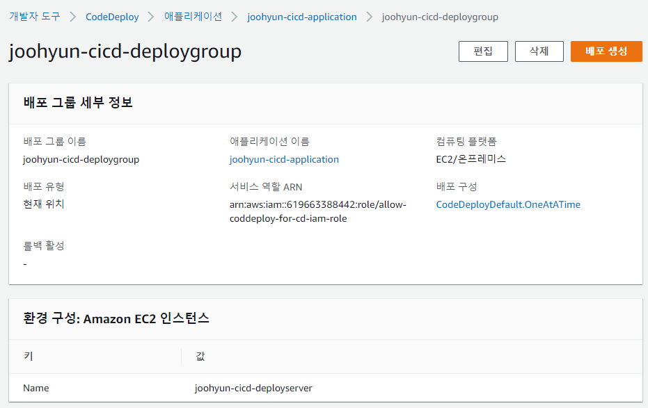 배포 그룹 이름과 CodeDeployRole 서비스 역할을 선택한다.