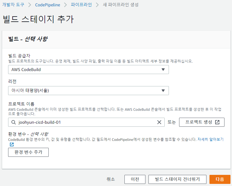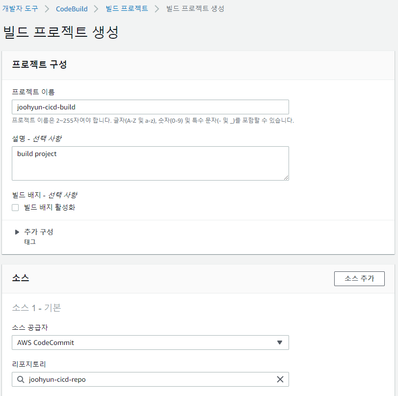 빌드 프로젝트 생성 페이지의 프로젝트 구성에 이 빌드 프로젝트의 이름을 지정한다.