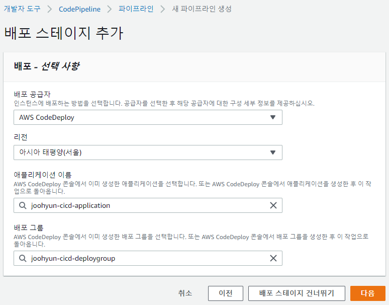 배포 단계 추가의 배포 공급자에서 AWS CodeDeploy를 선택한다.