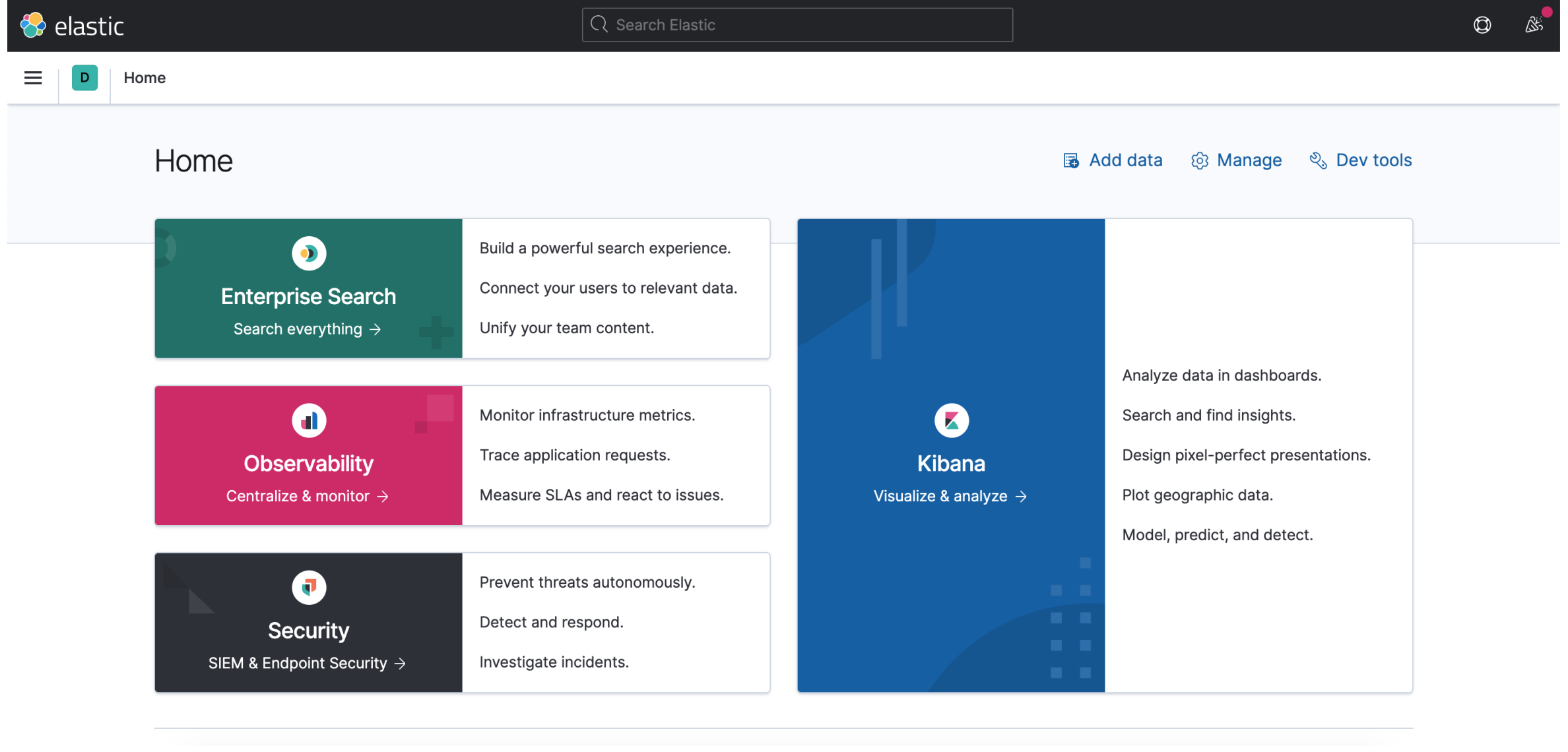 - systemctl restart kibana를 통해 재실행하고, 브라우저에서 http://서버IP:5601로 접속하여 확인한다.