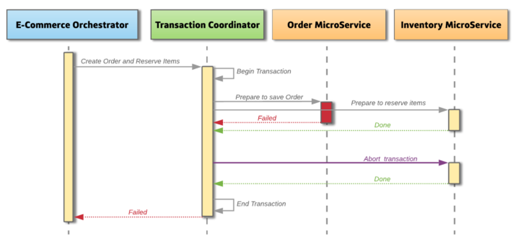 다음은 Two-Phase Commit 방안에서 실패한 경우 예시이다. 도중 서비스가 실패하면, Coordinator는 해당 트랜잭션을 중단 및 롤백한다. 아래 예시에서 InventoryMicroservice는 준비가 되었다고 응답했지만, OrderMicroservice는 실패하였고 이 경우 역시 Coordinator는 중단하여 InventoryMicroservice가 변경사항을 롤백하고 데이터베이스 Rock을 해제한다.