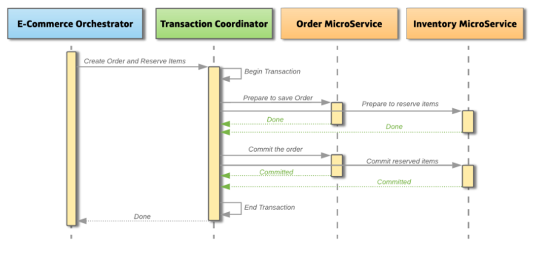 - Commit Phase : 이전 단계에서 트랜잭션을 시작할 준비가 되었다면, Coordinator는 Commit을 요청한다. 만약 서비스 하나라도 실패가 발생한다면, Coordinator는 관련된 모든 서비스에 해당 트랜잭션을 롤백하도록 요청한다.