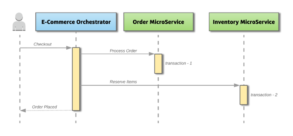 Orchestration 접근 방식을 구현한 E-Commerce 시스템을 예로 들어본다.