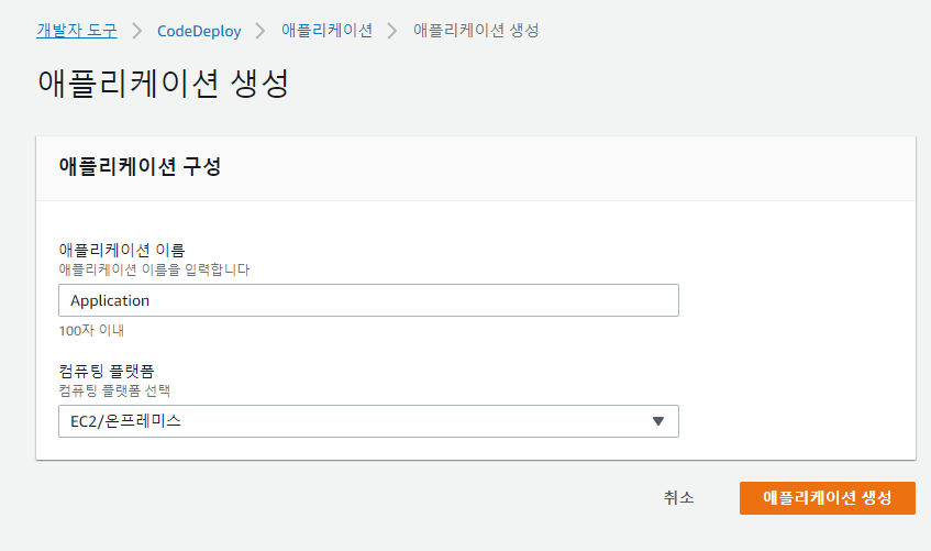 CodeDeploy에서 애플리케이션을 생성한다. CodeDeploy에서 애플리케이션은 배포할 코드를 식별한다.