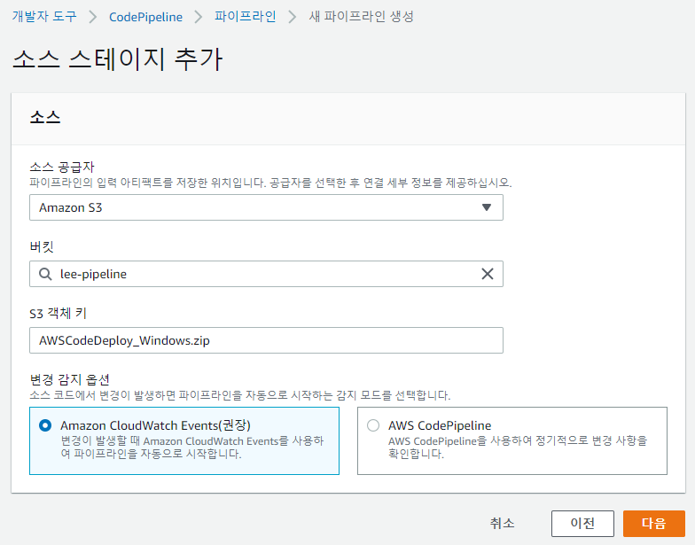 본문에서는 Amazon S3 버킷과 CodeDeploy를 사용하여 애플리케이션을 릴리스하는 두 단계 파이프라인을 생성한다. Amazon S3 소스가 포함된 파이프라인의 경우 Amazon CloudWatch Events가 소스 업데이트를 감지하고 변경이 발생할 때 파이프라인을 시작하게 된다.