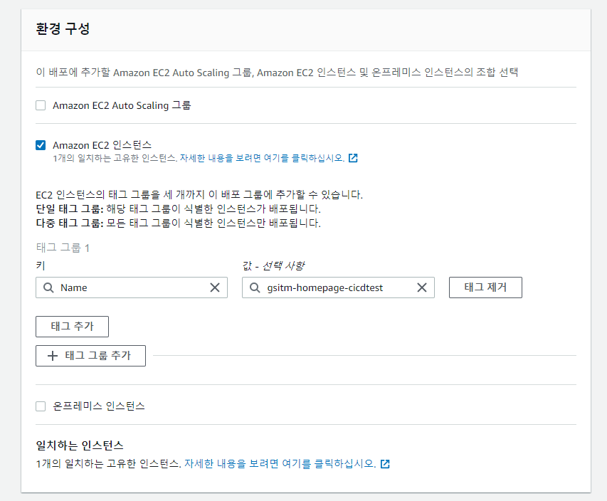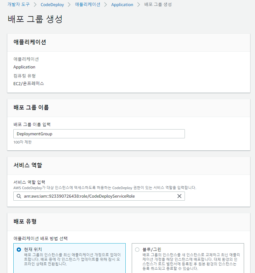 컴퓨팅 플랫폼에서 EC2/On-premises를 선택하고, 배포 구성은 CodeDeployDefault.OneAtaTime(한 번에 한 인스턴스에만 애플리케이션 개정 배포)을 선택한다.