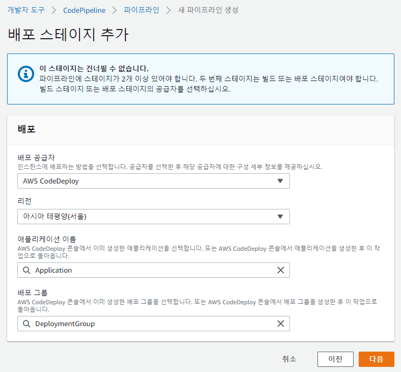 배포 스테이지에서는 해당하는 애플리케이션 이름과 배포 그룹을 지정한다.