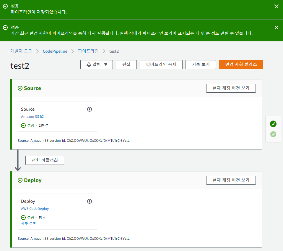완료 후 실행한다. 파이프라인에서 S3에 코드를 업로드하면 성공적으로 배포됨을 확인할 수 있다.